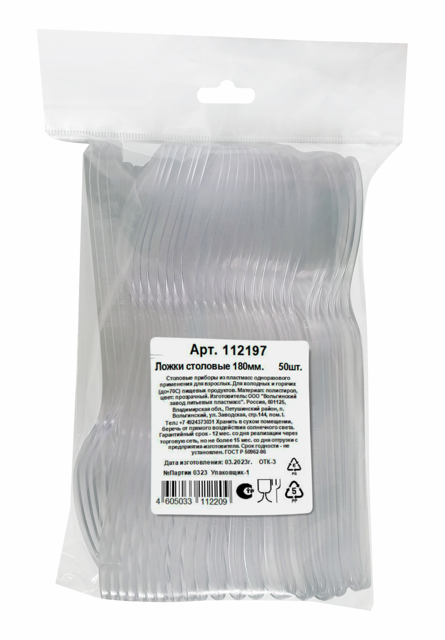 Ложка одноразовая пластиковая прозрачная 18см, 50шт