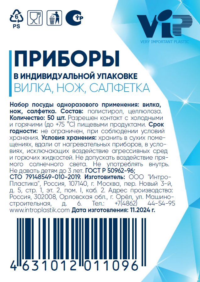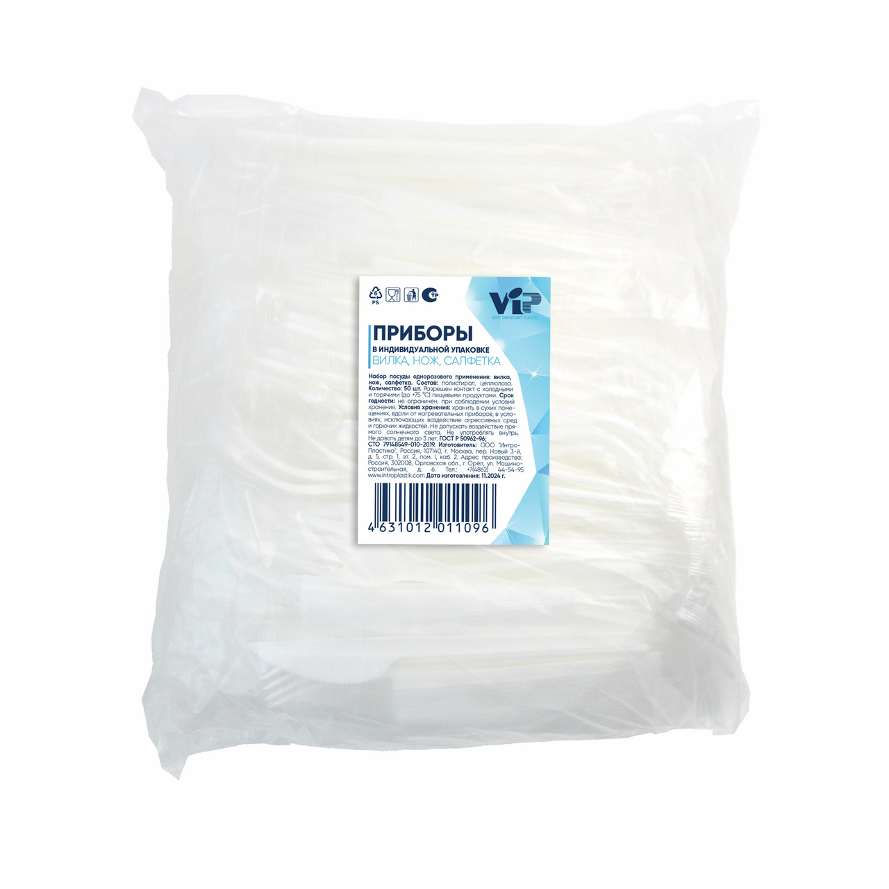 Набор одноразовых столовых приборов Vip с вилкой ножом и салфеткой, 50шт
