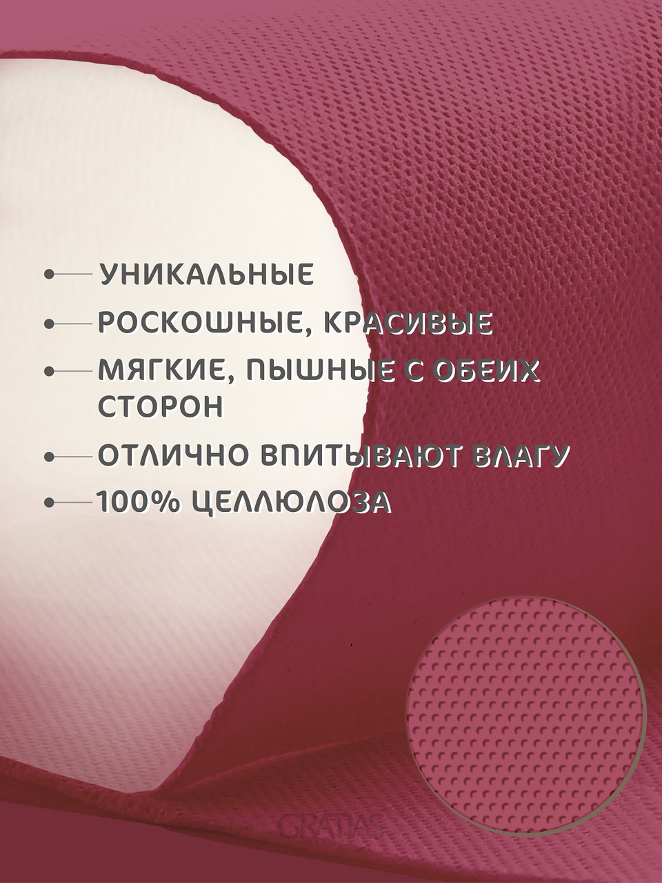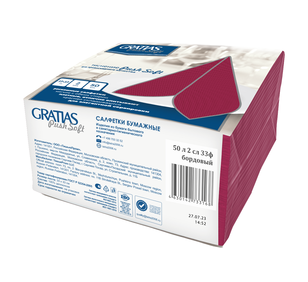 Бумажные салфетки Gratias с тиснением Push Soft - уникальным тиснением, которое обеспечивает феноменальную впитываемость и мягкость, имитирует структуру ткани. PUSH SOFT — это особое высокотехнологичное тиснение с большим количеством очень мелких точек. Эти салфетки хорошо держат форму, плотные и воздушные, они отлично поглощают влагу, за счет чего экономично расходуются, поэтому пачки хватает на продолжительное время. Двухслойные, имеют размер 33 на 33 см. в развернутом виде, в сложенном виде размер 16.5 на 16.5 см. Салфетки сделаны из премиальной бумагоосновы (Швеция).