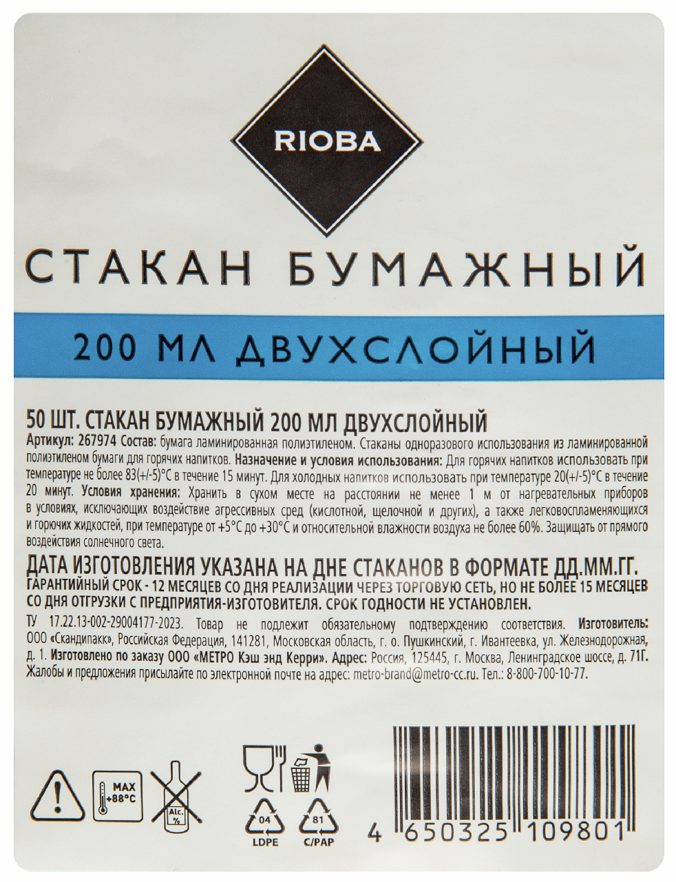 К стакану подходят крышки: 389507 100ШТ КРЫШКА Д/СТАКАНА RIOBA 200МЛ; 242727 50ШТ КРЫШКА ДЛЯ СТАКАНА VIP D80ММ С КЛАПАНОМ. Стакан одноразового использования из ламинированной бумаги с двойной стенкой (наружная стенка из бумаги с индивидуальным выдавливанием), для горячих и холодных напитков и продуктов. Стаканы могут использоваться с крышкой соответствующего диаметра. Крышка должна закрываться герметично. подходит для холодных и горячих напитков (кофе, кофейных напитков, чая и других).Матовая внешняя стенка позволяет комфортно держать стакан в руке. Гарантированная защита от протекания при использовании с крышкой Huhtamaki (диаметр 80 мм). Идеальная геометрия обеспечивает плотное прилегание крышки.