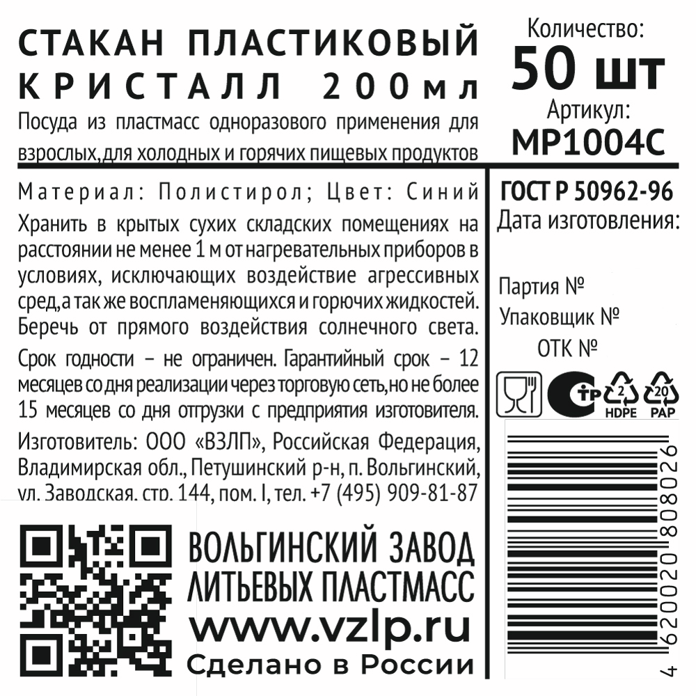 Стакан одноразовый Vzlp Кристалл пластиковый синий 200мл, 50шт