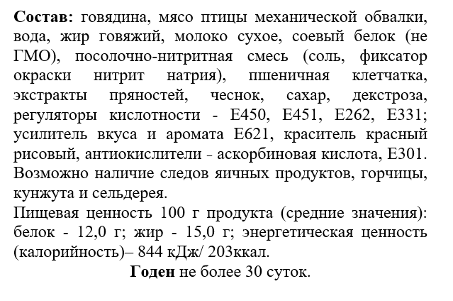 Говядина, мясо птицы механической обвалки, вода, жир говяжий, молоко сухое, соевый белок (не ГМО), посолочно-нитритная смесь (соль, фиксатор окраски нитрит натрия), пшеничная клетчатка, экстракты пряностей, чеснок, сахар, декстроза, регулятор кислотности - Е450, Е451, Е262, Е331; усилитель вкуса и аромата Е621, натуральный пищевой краситель красный рисовый, антиокислитель Е301.