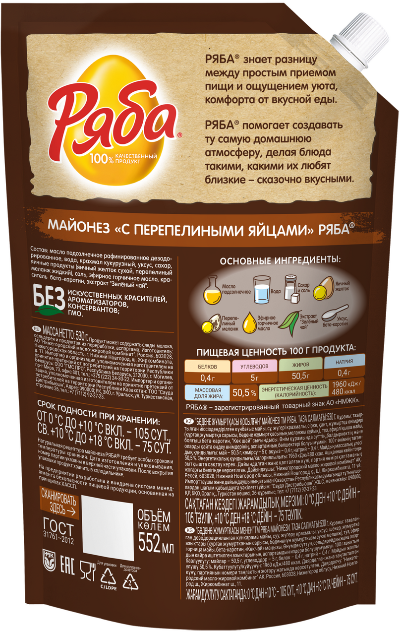 Майонез Ряба с Перепелиными яйцами придает готовому блюду особую изюминку за счет содержащихся в составе перепелиных яиц. Перепелиные яйца по своим питательным свойствам значительно превосходящие куриные. В майонезе Ряба только 100% натуральные ингредиенты - свежее растительное масло, яйца и специи. В нем нет искусственных консервантов, красителей и ароматизаторов. Натуральный майонез Ряба - продукт без ГМО. Вкус и качество майонеза сохраняются благодаря уникальной рецептуре и инновационным технологиям изготовления.