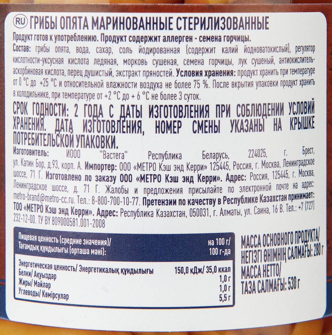 Грибы опята, вода, сахар, соль йодированная (содержит калий йодноватокислый), регулятор кислотности-уксусная кислота ледяная, морковь сушеная, семена горчицы, лук сушеный, антиокислитель - аскорбиновая кислота, перец душистый, экстракт пряностей.
