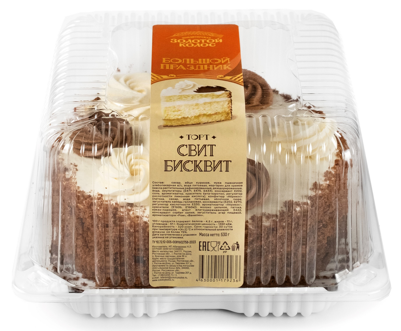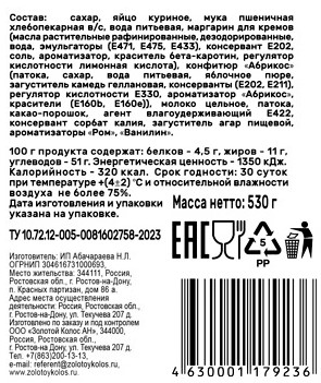 Сахар, яйцо куриное, мука пшеничная хлебопекарная высшего сорта, вода питьевая, маргарин для кремов (масла растительные рафинированные, дезодорированные, вода, эмульгаторы (Е471, Е475, Е433), консервант Е202, соль, ароматизатор, краситель бета-каротин, регулятор кислотности лимонная кислота), конфитюр Абрикос (патока, сахар, вода питьевая, яблочное пюре, загуститель камедь геллановая, консерванты (Е202, Е211), регулятор кислотности Е330, ароматизатор Абрикос, красители (Е160b, E160e)), молоко цельное, патока, какао-порошок, агент влагоудерживающий Е422, консервант сорбат калия, загуститель агар пищевой, ароматизаторы Ром, Ванилин.