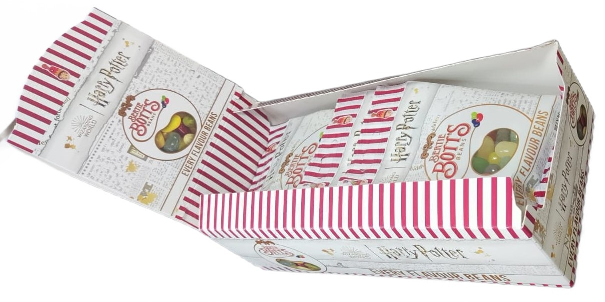 Драже жевательное Jelly Belly Harry Potter Bertie Bott's Beans, 54г x 12 шт - напомним вам предысторию конфет Harry Potter Bertie Bott's. Нищий кондитер Берти Бот экспериментировал с новыми видами сладостей в попытке создать прорывной товар. В процессе в котел случайно попал грязный носок самого Берти. Отведав результат своего труда, он вначале пришел в ужас от мерзости, которая у него получилась, а потом смекнул - неприятность можно использовать. Таких сладостей не делает никто. Интуиция не подвела Берти Бота. На волне успеха он выпустил бесконечное количество странных вкусов. В ход шла всякая ерунда: продукты из холодильника, отходы и даже, как это противно не звучит; отходы жизнедеятельности человека. Ух, какая гадость! Так откуда у названия конфет-бобов появилась приставка - Гарри Поттер? Все просто! Присутствие конфет Garry Potter Bertie Botts Beans прослеживается через все серии романов про приключения молодого волшебника. Они настолько гармонично вписаны в знаменитую сагу, что если создатель истории, Джоан Роулинг, уберет упоминания бобов, то кажется, характер главного героя, потеряет такую необыкновенно привлекательную изюминку. Это самые невероятные вкусы, собранные по всей волшебной вселенной Гарри Поттера. Ощутите себя ближе к любимым героям, почувствуйте атмосферу чародейства и волшебства вместе с Bertie Bott’s! Забавные желейные драже скрывают под цветной оболочкой следующие вкусы: банан, спелая вишня, свежескошенная трава, черный перец, вкус корицы, мыло, сосиска, зеленое яблоко, черника, грязь, лимон, мультифрукт, сопли, земляные червяки, рвота, зефир, арбуз, ушная сера, сахарная вата, протухшее яйцо - невероятные вкусы конфет Гарри Поттера способны удивительным образом оживить любую компанию друзей или родных, подняв настроение и превратив обычный вечер в невероятно яркое, надолго запоминающееся веселое событие.