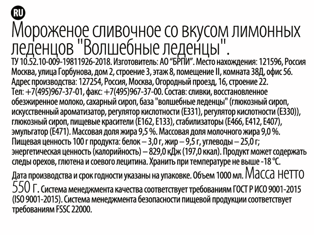 Сливки, восстановленное обезжиренное молоко, сахарный сироп, комплексная пищевая добавка леденцы-основа (сахар, ароматизатор, вода, регулятор кислотности лимонная кислота), глюкозный сироп, пищевые красители (Е162, Е133), стабилизаторы (Е466, Е412, Е407), эмульгатор (Е471).