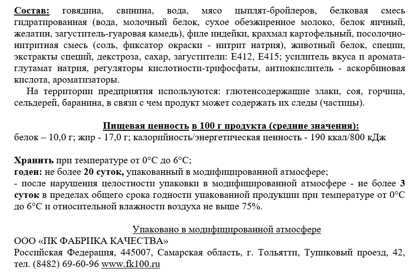 Говядина, свинина, вода, мясо цыплят-бройлеров, белковая смесь гидратированная (вода, молочный белок, сухое обезжиренное молоко, белок яичный, желатин, загуститель-гуаровая камедь), филе индейки, крахмал картофельный, посолочно-нитритная смесь (соль, фиксатор окраски - нитрит натрия), животный белок, специи, экстракты специй, декстроза, сахар, загустители: Е412, Е415; усилитель вкуса и аромата-глутамат натрия, регуляторы кислотности-трифосфаты, антиокислитель - аскорбиновая кислота, ароматизаторы.