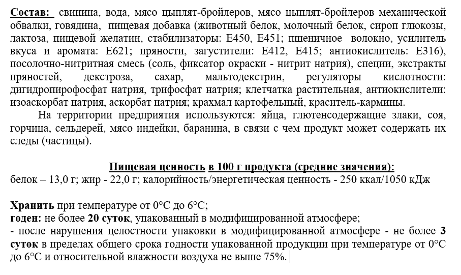 Свинина, вода, мясо цыплят-бройлеров, мясо цыплят-бройлеров механической обвалки, говядина, пищевая добавка (животный белок, молочный белок, сироп глюкозы, лактоза, пищевой желатин, стабилизаторы: Е450, Е451; пшеничное волокно, усилитель вкуса и аромата: Е621; пряности, загустители: Е412, Е415; антиокислитель: Е316), посолочно-нитритная смесь (соль, фиксатор окраски - нитрит натрия), специи, экстракты пряностей, декстроза, сахар, мальтодекстрин, регуляторы кислотности: дигидропирофосфат натрия, трифосфат натрия; клетчатка растительная, антиокислители: изоаскорбат натрия, аскорбат натрия; крахмал картофельный, краситель-кармины.