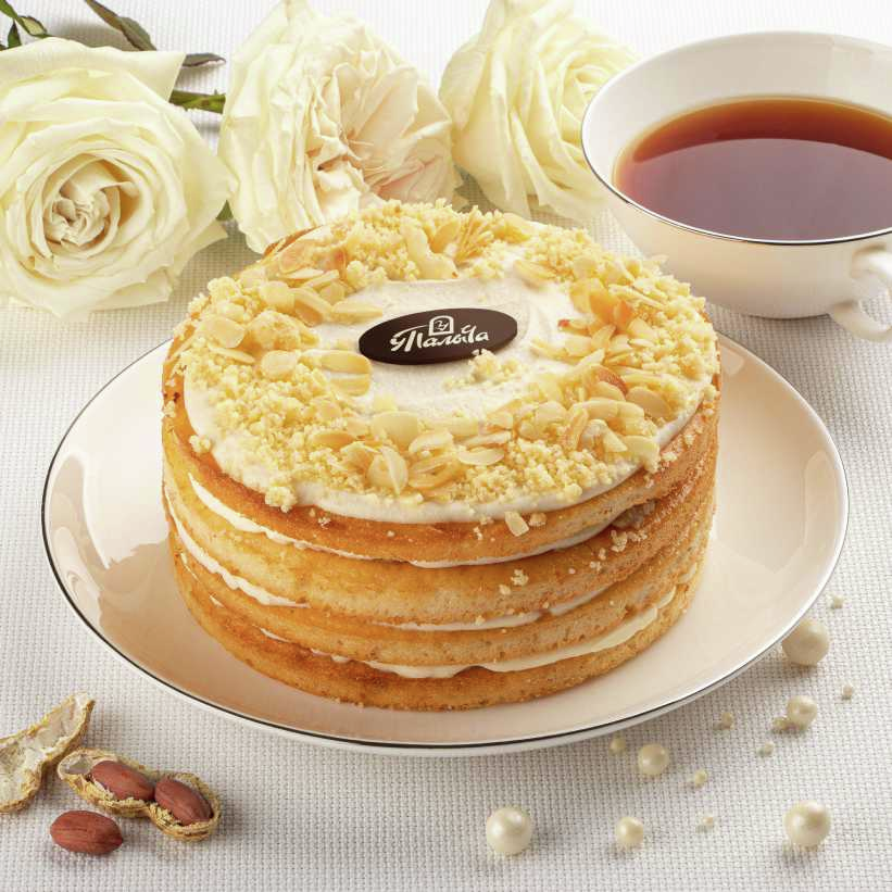 Нежный, бархатный бисквит на основе муки высшего сорта с добавлением сметаны и легкий заварной крем из сливочного масла и сметаны. Каждый слой бисквита пропитан сахарным пуншем, а в прослойке — хрустящий крокант из вафельной крошки и белого шоколада. Торт декорирован хрустящим штрейзелем и лепестками обжаренного арахиса. Необычное оформление этого десерта не оставит никого равнодушным. Этот десерт идеально подойдет к чашечке чая или кофе.