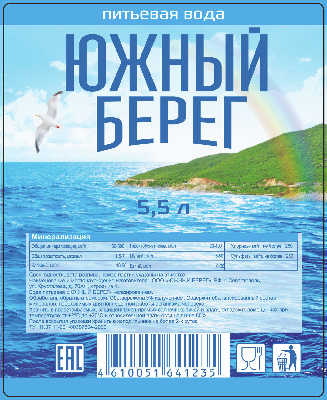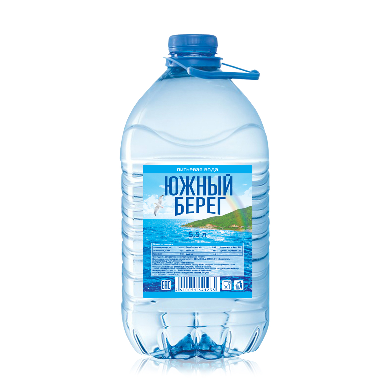 Вода Южный берег питьевая негазированная, 5.5л обработана обратным осмосом, обеззаражена Уф излучением. Уникальная по своему происхождению и составу. На заводе вода проходит очистку на лучшем немецком оборудовании. Производитель насыщает воду дополнительными витаминами и минералами, от чего она становится вкуснее и полезнее.