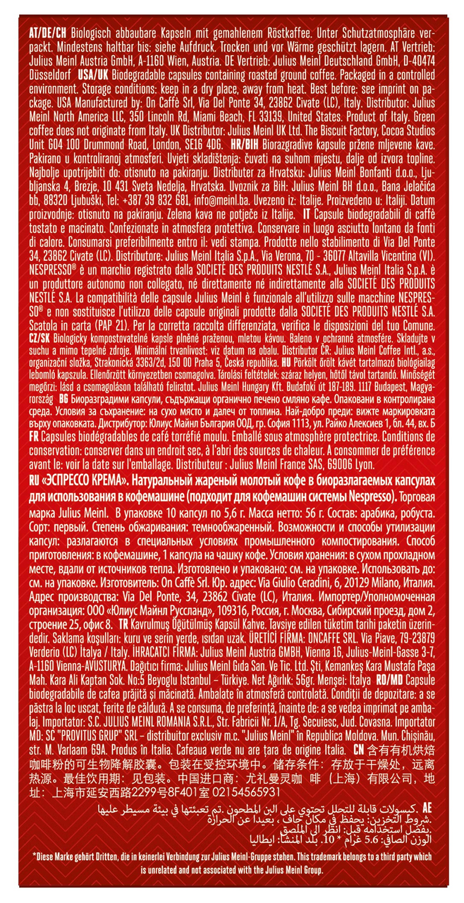 Кофе в капсулах Julius Meinl Espresso Crema Bio для кофемашин Nespresso 10шт, 56г x 10 шт