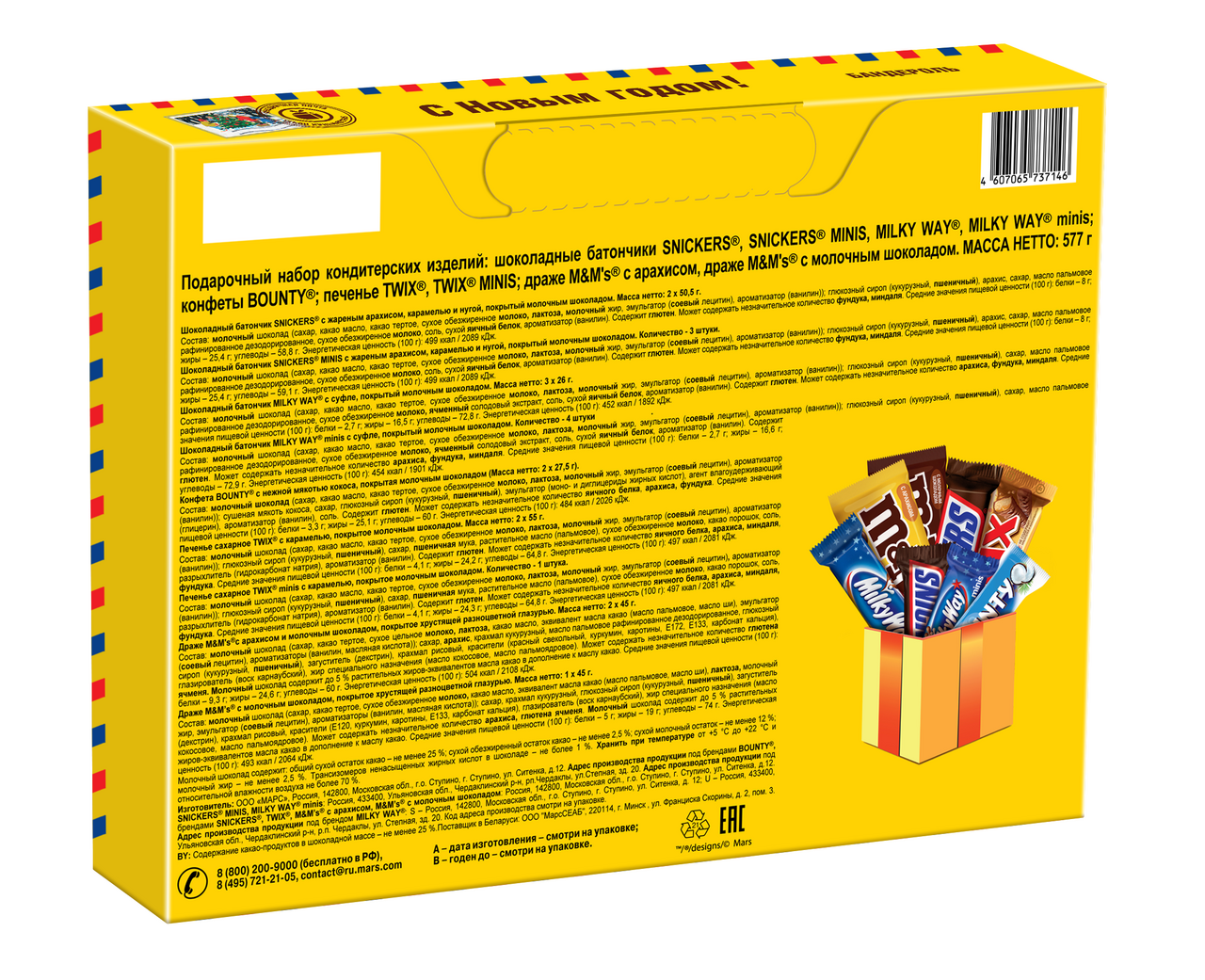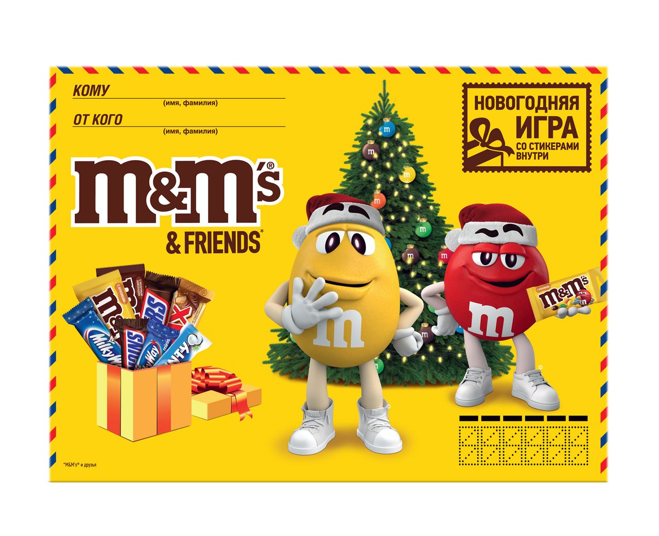 Подарочный набор M&M's & Friends Большая посылка – способ порадовать близких в наступающий Новый год и Рождество 2024. Сладкий новогодний подарок содержит в себе драже M&M's и любимые шоколадные батончики Snickers, Mars, Twix, Milky Way, Bounty. Новогодняя подарочная упаковка в форме посылки, веселые герои M&M's и любимые сладости – отличное угощение на праздничный стол и прекрасный подарок для ребенка.