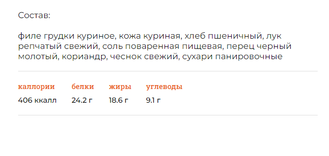 Филе грудки куриное, кожа куриная, хлеб пшеничный, соль поваренная пищевая, перец черный молотый, кориандр, чеснок свежий, сухари панировочные.