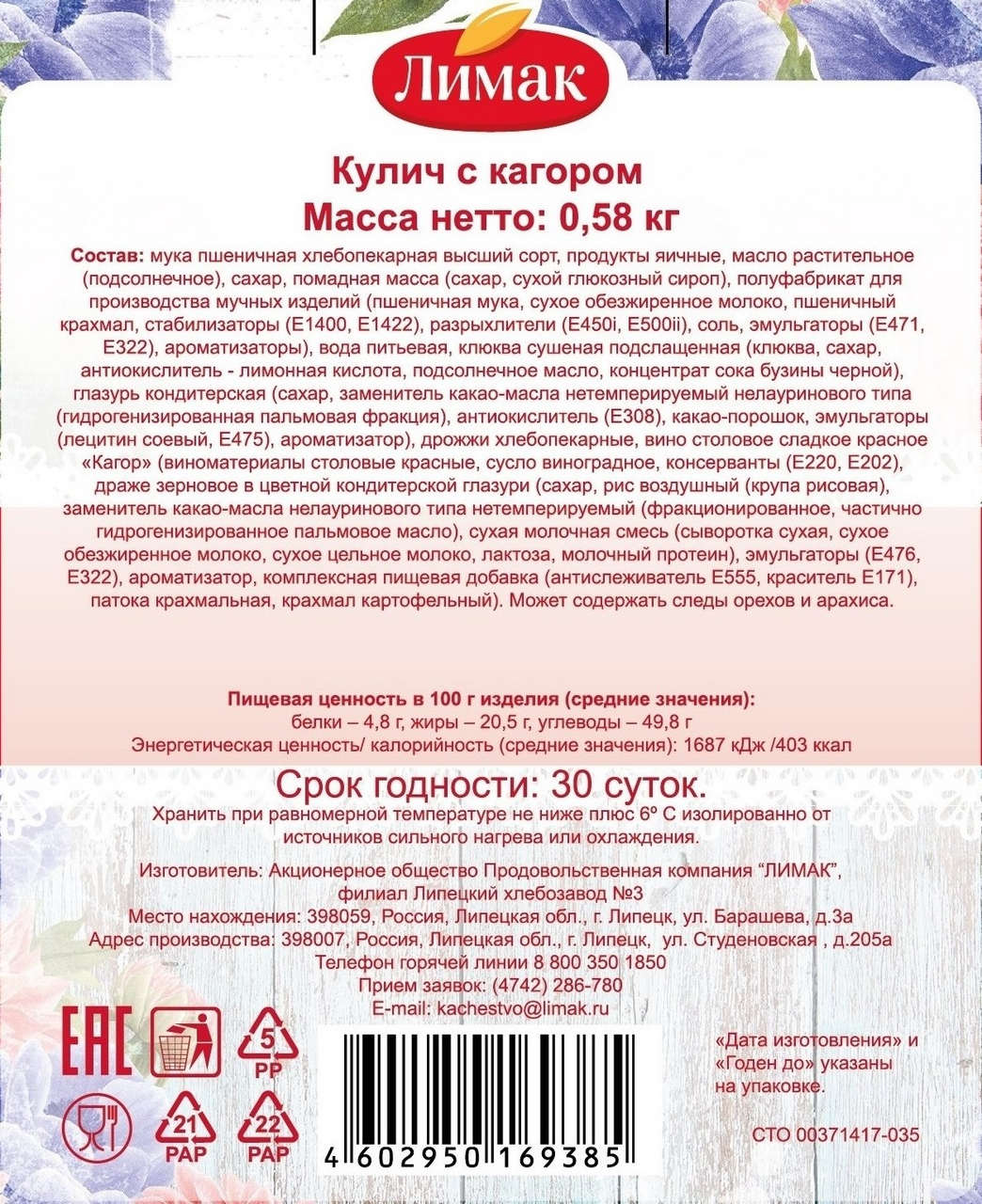 Кулич с кагором Лимак 580г