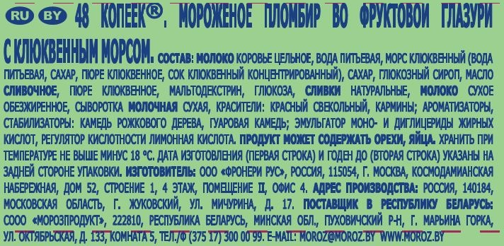 Молоко коровье цельное, вода питьевая, морс клюквенный (вода питьевая, сахар, пюре клюквенное, сок клюквенный концентрированный), сахар, глюкозный сироп, масло сливочное, пюре клюквенное, мальтодекстрин, глюкоза, сливки натуральные, молоко сухое обезжиренное, сыворотка молочная сухая, красители: красный свекольный, кармины, ароматизаторы, стабилизаторы: камедь рожкового дерева, гуаровая камедь, эмульгатор моно- и диглицериды жирных кислот, регулятор кислотности лимонная кислота.