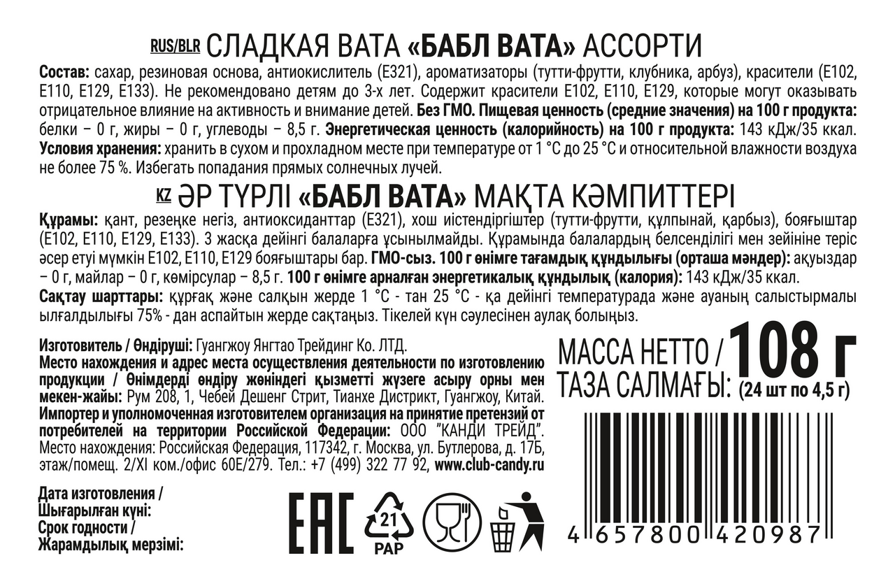 Вата сладкая Канди клаб Вата ассорти, 5г x 24 шт - лидер продаж в сегменте детской кондитерской продукции, совмещает в себе наслаждение вкуса сладкой ваты переходящей в жевательную резинку. Яркий вкус сохраняется продолжительное время. В одном блоке представлены четыре популярных среди детей вкуса. Отличается от других своим разнообразием вкусовых наполнителей. Позволяет насладиться ее вкусом всем дружным семейством или на вечеринке с друзьями. Представлена в следующих вкусах: клубника, арбуз, кола, тутти-фрутти. Не рекомендовано детям до 3-х лет.