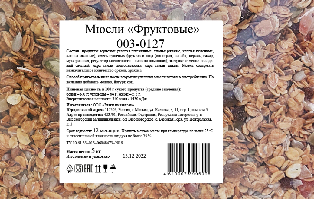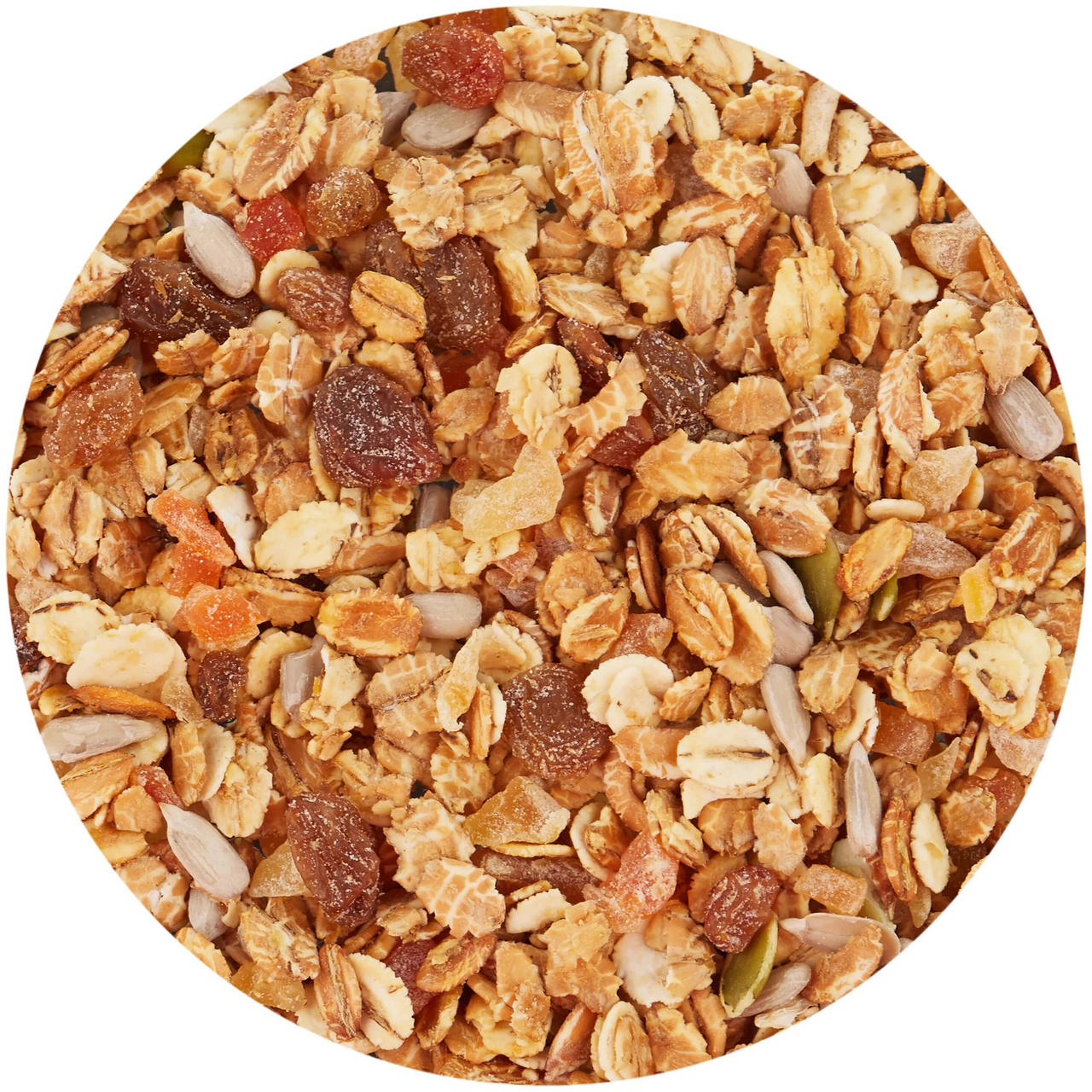Цельные злаки богаты клетчаткой, витаминами и минералами, они с самого утра настраивают правильное пищеварение и очищают организм от шлаков, фрукты дарят энергию и поднимают настроение. Такие мюсли прекрасно сочетаются с молоком, натуральным йогуртом и кефиром. Продукт регулярно проходит экспертизу качества в финской лаборатории.