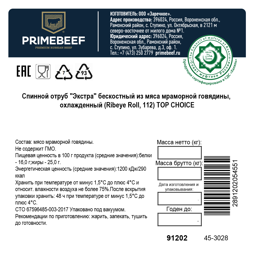 Отруб спинной говяжий Primebeef Халяль без кости охлажденный, ~5кг - спинной отруб, отличается сочностью, нежностью и превосходной мраморной текстурой. Характерная особенность Рибая - исключительно мягкое мясо, так как мышцы в его структуре практически не рабочие и не задействованы в движении бычка. Традиционный Рибай с равномерным распределением жировых прослоек, абсолютно белых по цвету. Особый сладковатый привкус мяса достигается за счет кукурузного откорма.Предназначен для самых популярных в мире одноименных стейков Рибай. Стейки из этого отруба практически невозможно испортить. Их можно готовить на гриле, на мангале, на сковороде. За счет высокой температуры приготовления, жировые прослойки плавятся, насыщая мясные волокна питательным соком. Для стейков Рибай можно использовать только базовые специи - соль, перец и оливковое масло.