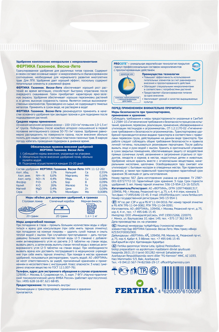 Полный гранулированный комплекс минералов и необходимых микроэлементов. Усиливает вегетацию и интенсивность окраски травы, ускоряет рост после стрижки, формирует плотный изумрудный газон в течение всего теплого сезона. Способ применения: удобрять газон рекомендуется перед посевом, а затем после каждой второй стрижки (раз в 15-20 дней) в течение весны и лета. Гранулы вносят в почву только в сухом виде, после чего обязательны обильный полив и смывание препарата с листовых пластинок. При расчете расхода удобрения необходимо руководствоваться инструкцией.