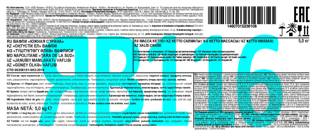 Вафли Яшкино Южная страна, 5кг