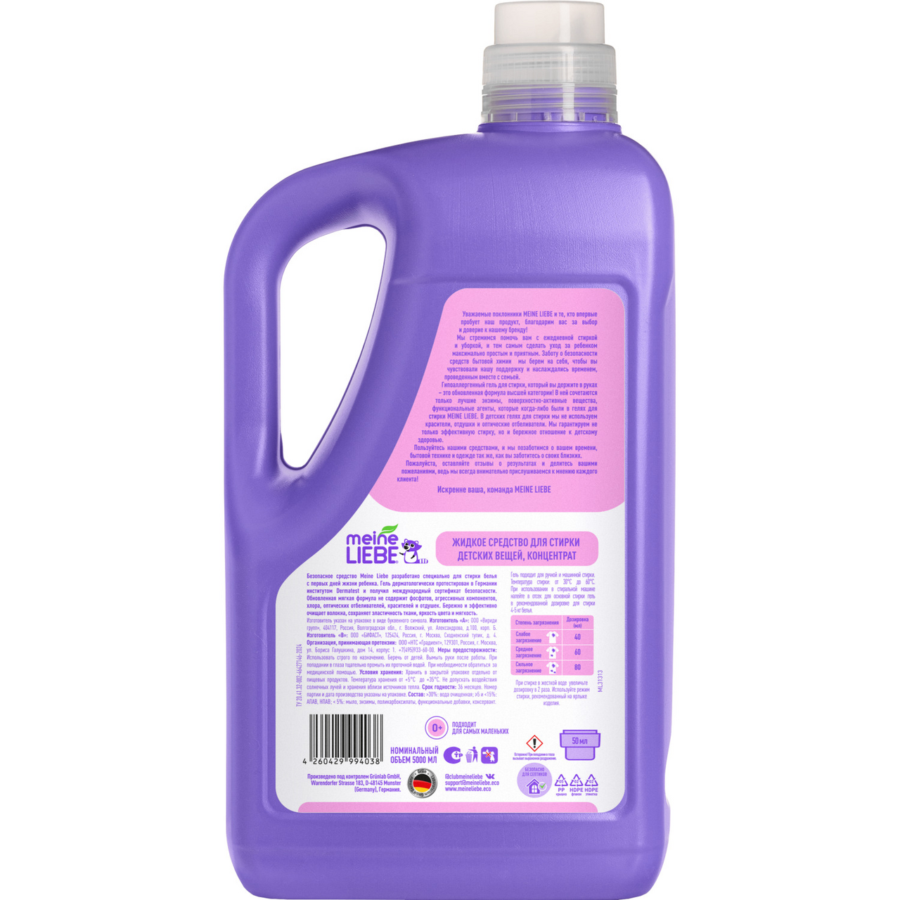 Гипоаллергенный гель для стирки Meine Liebe - это обновленная формула высшей категории для безопасной стирки белья с первых дней жизни ребенка. Средство бережно и эффективно очищает волокна, сохраняет эластичность ткани, яркость цвета и мягкость. Гель дерматологически протестирован в Германии институтом Dermatest и получил международный сертификат безопасности. В формуле Meine Liebe сочетаются только лучшие энзимы, поверхностно-активные вещества, функциональные агенты. Обновленная мягкая формула не содержит красители, ароматизаторы, отдушки и оптические отбеливатели. В детских средствах мы никогда не используем фосфаты, агрессивные компоненты и хлор. Так мы гарантируем не только эффективную стирку, но и бережное отношение к детскому здоровью. Мы стремимся помочь вам с ежедневной стиркой и уборкой, и тем самым сделать уход за ребенком максимально простым и приятным. Заботу о безопасности средств бытовой химии мы берем на себя, чтобы вы чувствовали нашу поддержку и наслаждались временем, проведенным вместе с семьей. Бытовая химия Meine Liebe безопасна для домов с автономными канализациями (септиками). Все средства Meine Liebe изготовлены по уникальной формуле под контроль качества компании Grunlab (Германия), что гарантирует их надежность и эффективность.
