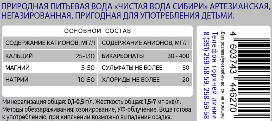 Природная питьевая вода Чистая вода Сибири артезианская, негазированная, пригодная для употребления детьми. Изготовлена по ТУ 10.86.10-002-30453928-2019. Методы обеззараживания: озонирование, УФ-облучение. Вода готова к употреблению, при кипячении возможно выпадение осадка.