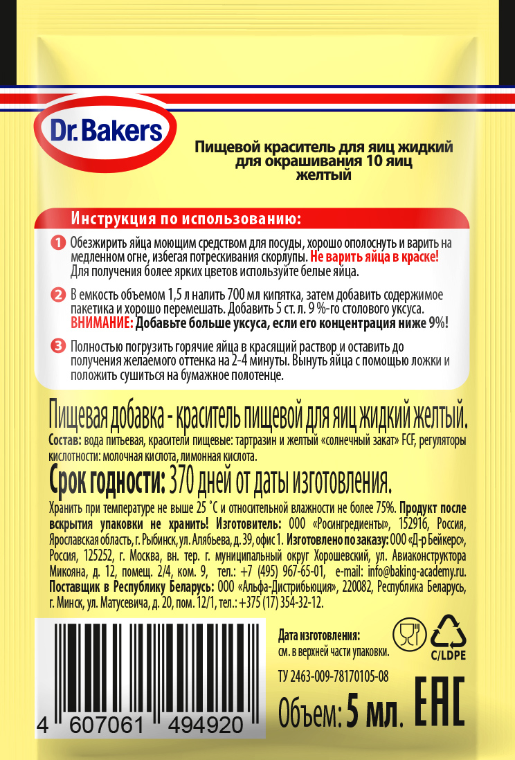 Краситель пищевой Dr.Bakers для яиц жидкий желтый, 5мл