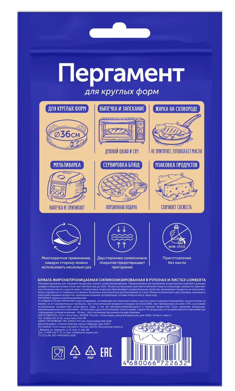 Пергамент для круглых форм предназначен для выпечки, упаковки и приготовления пищи. Благодаря наличию высечек по всему диаметру, лист пергамента повторяет круглую форму посуды. Силиконовое покрытие не позволит блюду пригореть, а также легко даст отделить его как от рабочих поверхностей, так и от самого пергамента. Диаметр листа 36см с высечками по всему диаметру размером 5см. С силиконизированными пергаментами для круглых форм вы можете запекать в духовом шкафу, жарить без использования жиров (подходит только для электрических плит), варить на пару, раскатывать тесто без муки, порционно замораживать продукты, разогревать блюда в СВЧ-печи. Предназначена для выпечки в духовках электрических и газовых плит, СВЧ-печей. Листы идеально подходят под стандартные размеры противня и имеют качественное двустороннее силиконовое покрытие не нуждаются в смазке, это исключает прилипание и пригорание пищи. Бумага для выпечки выдерживает высокие температуры до 220 градусов, не пропускает жир и воду.
