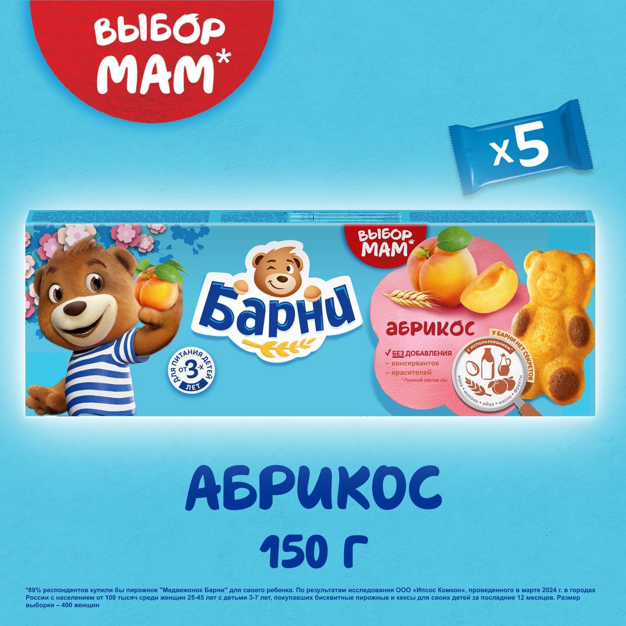 Бисквитное пирожное Барни с начинкой Абрикосовый джем - специально разработанное для детей кондитерское изделие в виде медвежонка. Обогащено кальцием, необходимым для здорового роста и развития детей, не содержит красителей и консервантов. Рекомендовано для детей дошкольного возраста от 3х лет.