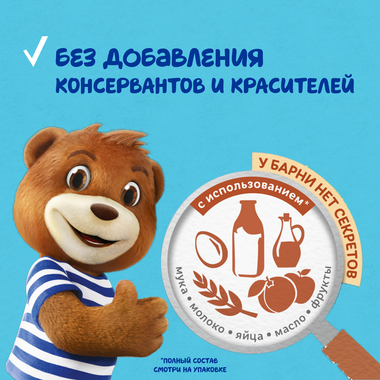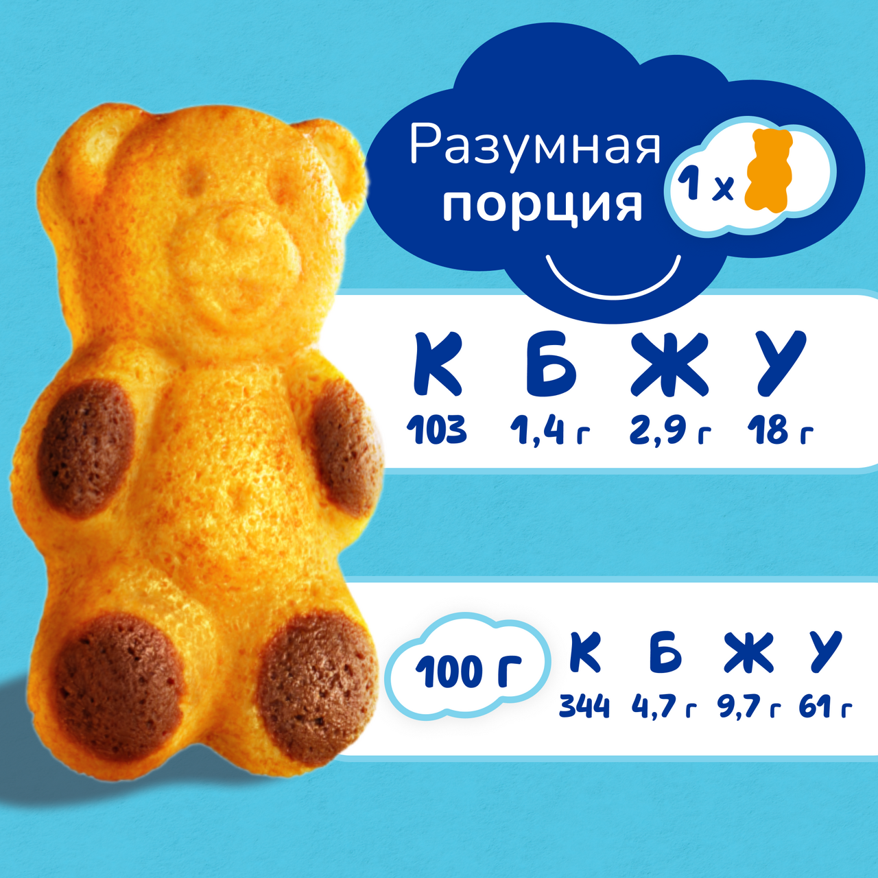Сироп глюкозно-фруктозный, мука пшеничная, яйца, сахар, агент влагоудерживающий (глицерин), пюре абрикосовое, масло рапсовое, пюре яблочное концентрированное, вода, молоко сухое обезжиренное, молоко сухое цельное, регуляторы кислотности (гидрокарбонат калия, кислота лимонная, карбонат калия), разрыхлитель (дигидропирофосфат натрия), эмульгаторы (эфиры глицерина и молочной и жирных кислот, эфиры полиглицерина и жирных кислот), соль, какао-порошок, ароматизаторы натуральные, загуститель (ксантановая камедь).