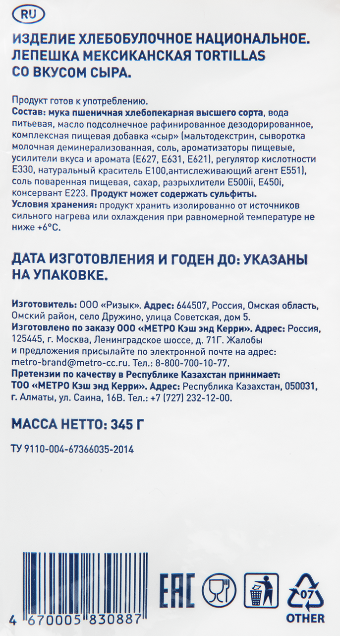 METRO Chef Лепешка мексиканская Тортилья сырная 23-25см, 345г