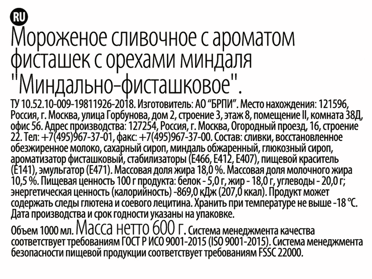 Сливки, восстановленное обезжиренное молоко, сахарный сироп, миндаль обжаренный, глюкозный сироп, ароматизатор фисташковый, стабилизаторы (Е466, Е412, Е407), эмульгатор (Е471), пищевой краситель (Е141).