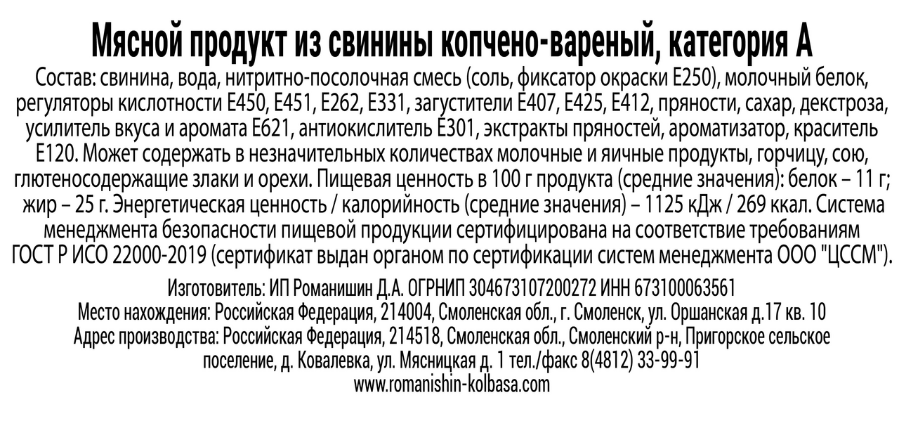 Свинина, вода, нитритно-посолочная смесь соль, фиксатор окраски Е250, молочный белок, регуляторы кислотности Е450, Е451, Е262, Е331, загустители Е407, Е425, Е412, специи, сахар, декстроза, усилитель вкуса и аромата Е621, экстракты специй, ароматизатор натуральный, краситель Е120.