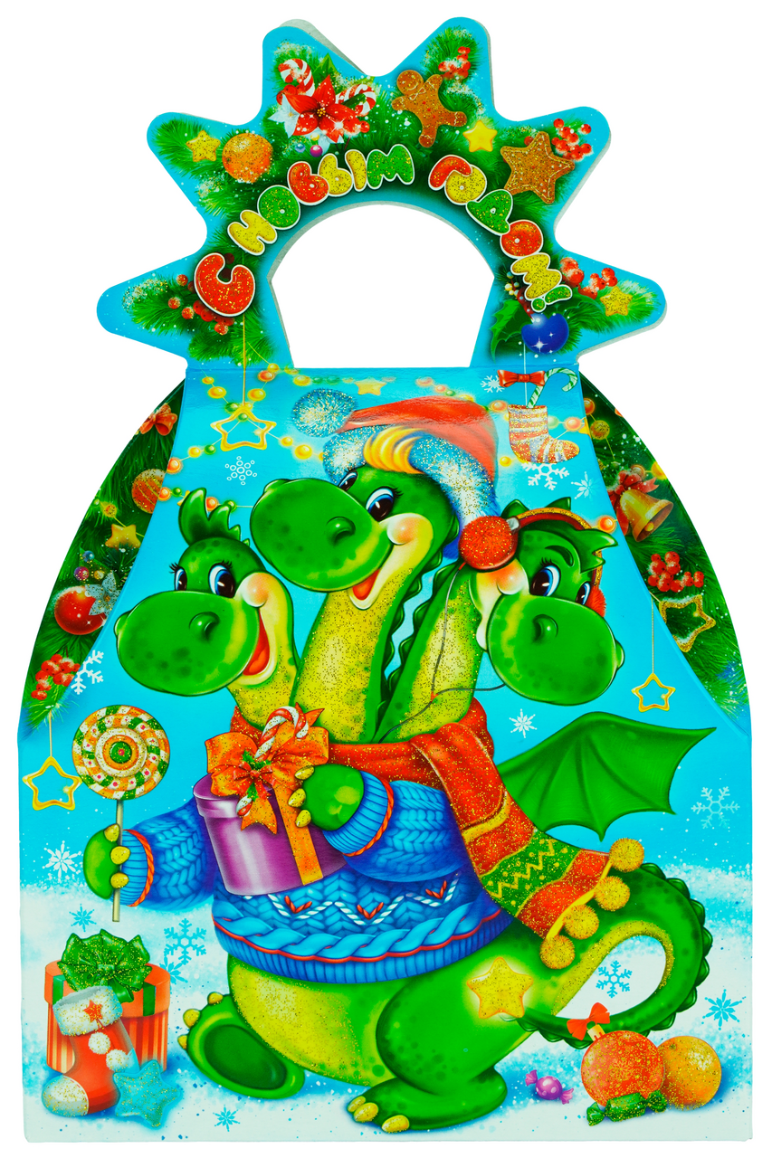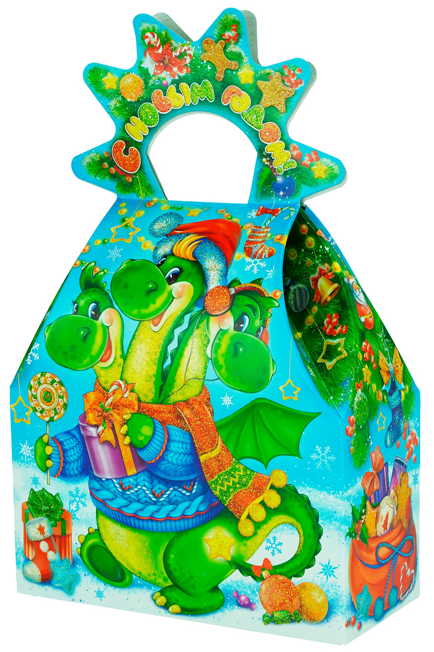 Содержит кондитерские изделия кондитерских фабрик Пензенская кондитерская фабрика, Невский кондитер, Рот Фронт, КДВ, Сормовская кондитерская фабрика, БКК Коломенский, Коломенское поле. Яркая, праздничная форма подарка с добродушным сюжетом, герой которого - трижды очаровательный дракон. Кондитерские изделия упакованы в отдельный пластиковый пакет, который находится внутри подарочной картонной коробки украшенной блестками.