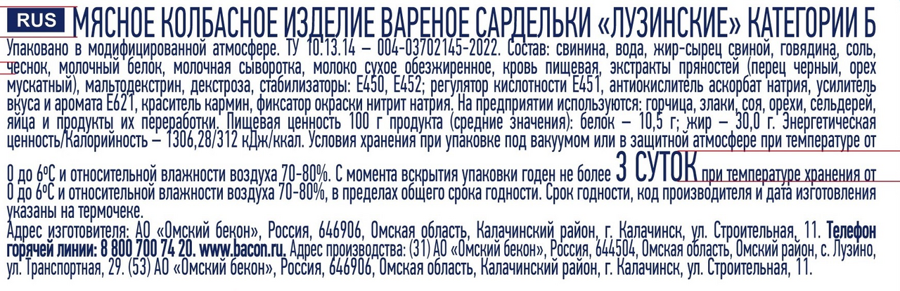 Свинина, вода, жир-сырец свиной, говядина, соль, чеснок, молочный белок, молочная сыворотка, молоко сухое обезжиренное, кровь пищевая, экстракты пряностей (перец черный, орех мускатный), мальтодекстрин, декстроза, стабилизаторы: E450, E452, регулятор кислотности E451, антиокислитель аскорбат натрия, усилитель вкуса и аромата E621, краситель кармин, фиксатор окраски нитрит натрия.