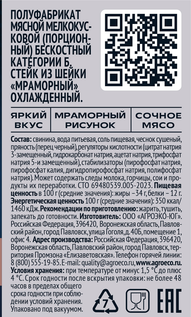 Стейк из шейки мраморный со специями Duroc Агроэко – это линейка премиальной свинины от компании Агроэко, топ -4 производитель свинины в России. Компания выращивает породу Duroc на собственных фермах. Мясо породы Duroc Агроэко отличается особой сочностью и нежностью, благодаря породе и специально подобранному рациону кормления с большим содержаниям белка. Наличие жировых прослоек, формирующие мраморный рисунок, придают готовому блюду яркий вкус и сочность. Стейк из шейки мраморный со специями Duroc Агроэко идеально подходит для приготовления стейков на огне или гриле. Классическое сочетание специй из чеснока и перца делает вкус готового блюда еще более выразительным. Стейк легко и быстро готовить. Продукт уже замаринован и откалиброван на одинаковые по толщине стейки. Готовое блюдо вкусное, имеет тонкий мясной аромат, особую нежность и сочность. Стейк из шейки мраморный отлично сочетается с овощами гриль или легким салатом. Это бескостные порционные кусочки шейного отруба с жировыми прослойками разного размера. При термической обработке они тают и делают мясо сочным и нежным. Такие стейки можно готовить практически любым способом: жарить на сковороде и на гриле, запекать в духовке со специями или под соусом, делать отбивные и многое другое. Не содержит ГМО. Продукт упакован с использованием защитной атмосферы, что позволяет сохранить все питательные и вкусовые качества в течение всего срока годности.