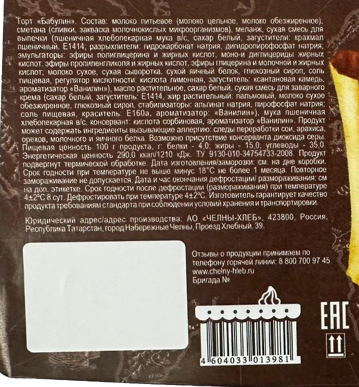 Молоко питьевое (молоко цельное, молоко обезжиренное), сметана (сливки, закваска молочнокислых микроорганизмов), меланж, сухая смесь для выпечки (пшеничная хлебопекарная мука высшего сорта, сахар белый, загустители: крахмал пшеничный, Е1414, разрыхлители: гидрокарбонат натрия, дигидропирофосфат натрия, эмульгаторы: эфиры полиглицерина и жирных кислот, моно- и диглицериды жирных кислот, эфиры пропиленгликоля и жирных кислот, эфиры глицерина и молочной и жирных кислот, молоко сухое, сухая сыворотка, сухой яичный белок, глюкозный сироп, соль пищевая, регулятор кислотности: кислота лимонная, загуститель: ксантановая камедь, ароматизатор ванилин), масло растительное, сахар белый, сухая смесь для заварного крема (сахар белый, загуститель: Е1414, жир растительный: пальмовый, молоко сухое обезжиренное, глюкозный сироп, стабилизаторы: альгинат натрия, пирофосфат натрия, соль пищевая, краситель: Е160а, ароматизатор: ванилин), пшеничная хлебопекарная мука высшего сорта, консервант: кислота сорбиновая, ароматизатор ванилин.