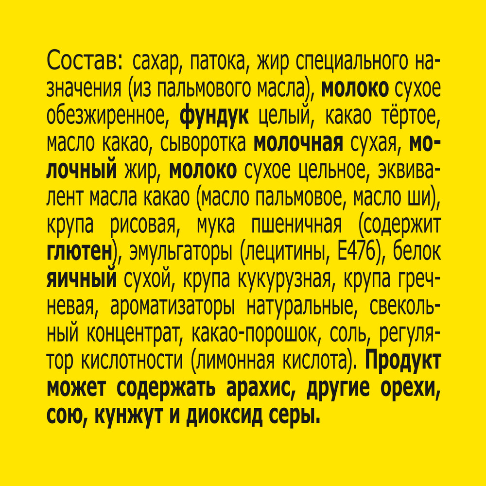 Сахар, патока, жир специального назначения (из пальмового масла), молоко сухое обезжиренное, фундук целый, эквивалент масла какао (масло пальмовое, масло ши), какао тертое, сыворотка молочная сухая, молочный жир, молоко сухое цельное, крупа рисовая, свекольный концентрат, мука пшеничная (содержит глютен), эмульгаторы (лецитины, Е 476), белок яичный сухой, крупа кукурузная, крупа гречневая, ароматизаторы натуральные, какао-порошок, соль, регулятор кислотности (лимонная кислота).
