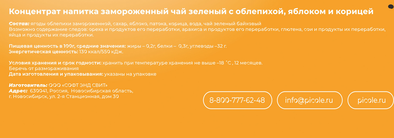 Чай фруктово-ягодный Picole Зеленый с облепихой яблоком и корицей замороженный, 60г это концентрат напитка замороженный чай зеленый с облепихой, яблоком и корицей.