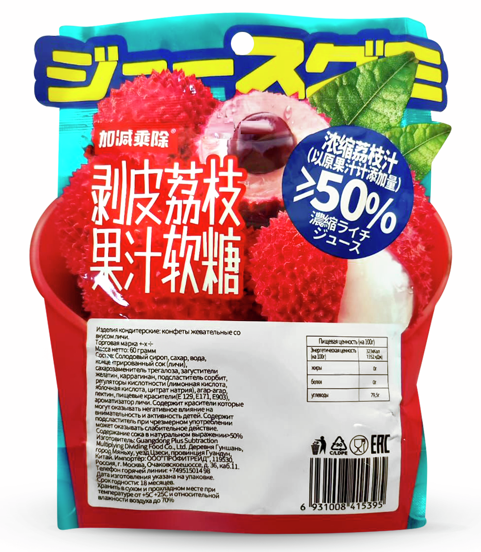 Солодовый сироп, сахар, вода, концентрированный сок (личи), сахарозаменитель трегалоза, загустители желатин, каррагинан, подсластитель сорбит, регуляторы кислотности (лимонная кислота, яблочная кислота, цитрат натрия), агар-агар, пектин, пищевые красители (Е129, Е171, Е903), ароматизатор личи.