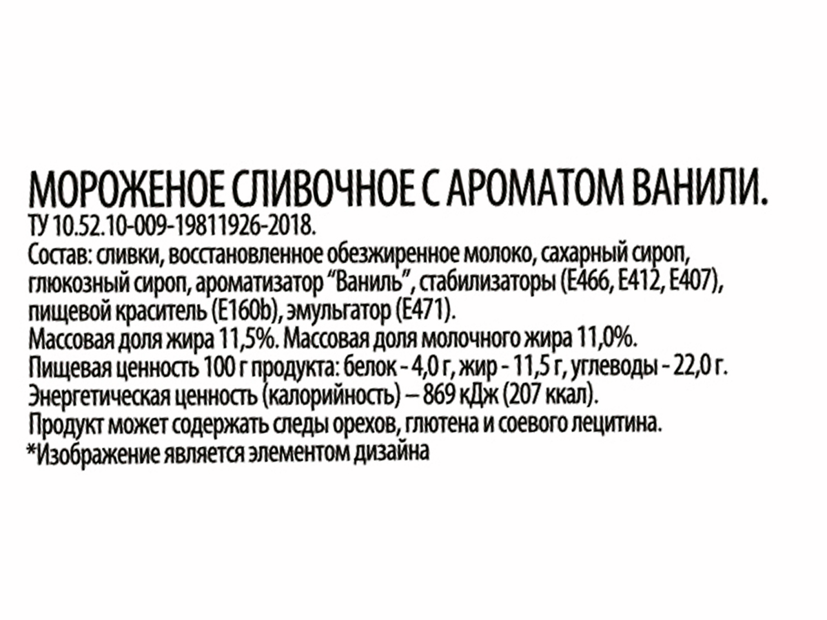 Сливки, восстановленное обезжиренное молоко, сахарный сироп, глюкозный сироп, стабилизаторы (Е466, Е412, Е407), ароматизатор Ваниль, эмульгатор (Е471), пищевой краситель (Е160b).