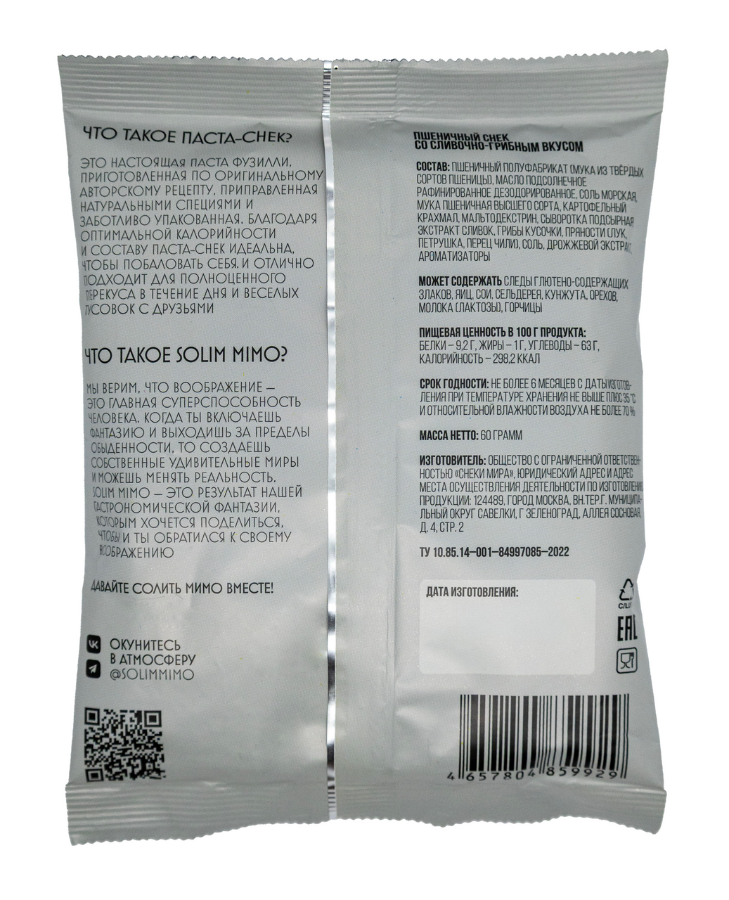 Наслаждайтесь тонким и приятным сливочным вкусом с добавлением грибов. Cнеки Solim Mimo сочетают в себе нежные сливки с ароматными грибами, приправленные пряностями. Это гармоничное сочетание создает идеальный баланс сливочного вкуса, который обязательно порадует вас во время перекуса. Снеки сочетают нежные сливки с ароматными грибами, приправленные пряностями. Это гармоничное сочетание создает идеальный баланс сливочного вкуса, который обязательно порадует вас во время перекуса. Это настоящая паста фузилли, приготовленная по оригинальному авторскому рецепту, приправленная натуральными специями и заботливо упакованная. Благодаря оптимальной калорийности и составу паста-снек идеальна, чтобы побаловать себя и отлично подходит для полноценного перекуса в течение дня и веселых тусовок с друзьями.