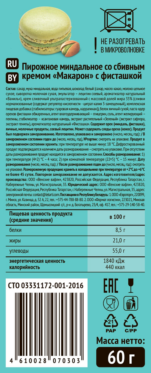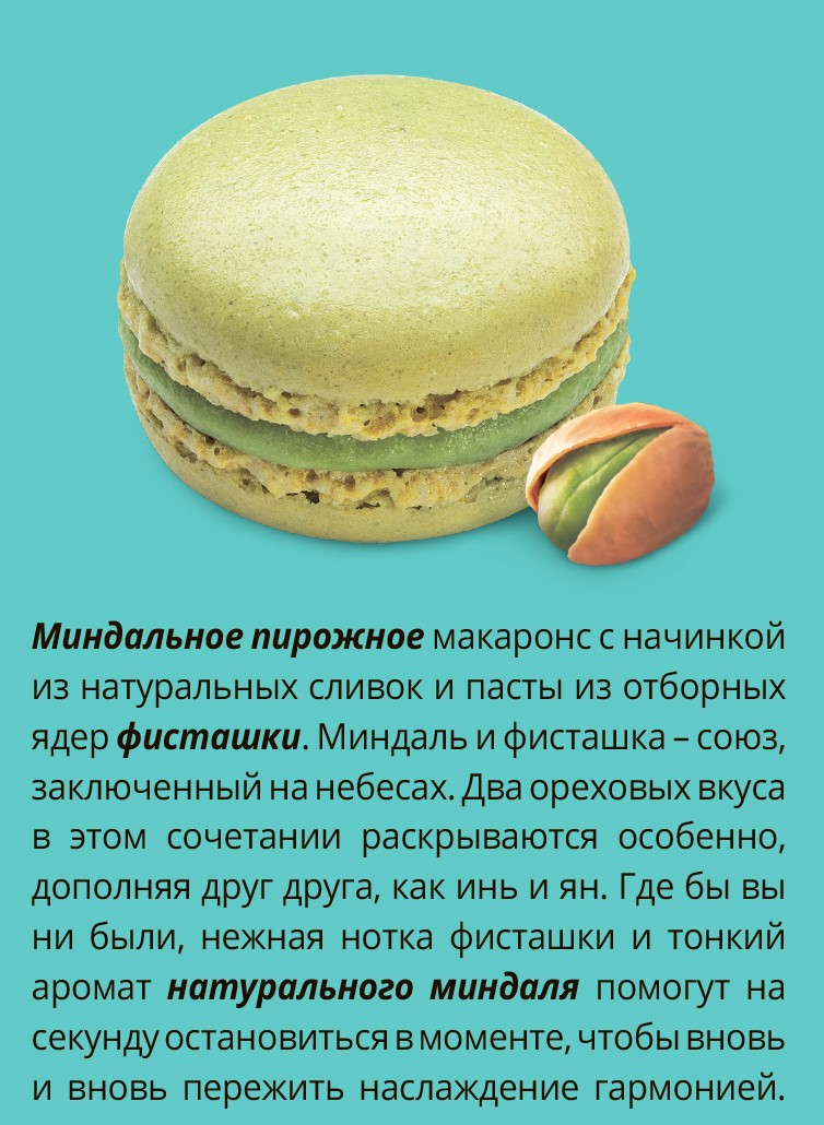 Миндальное пирожное макаронс с начинкой из натуральных сливок и пасты из отборных ядер фисташки. Два ореховых вкуса в этом сочетании раскрываются особенно, дополняя друг друга. Где бы вы ни были, нежная нотка фисташки и тонкий аромат натурального миндаля помогут на секунду остановиться в моменте, чтобы вновь и вновь пережить наслаждение гармонией.