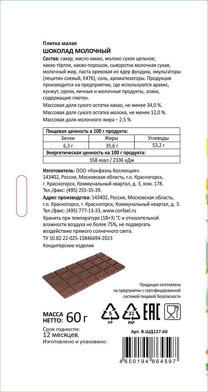 Шоколад Конфаэль молочный, 60г