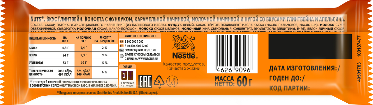 Погрузись в атмосферу зимних праздников с новинкой Nuts со вкусом глинтвейна и апельсина! Эта шоколадная конфета сочетает в себе цельный фундук, насыщенную карамельную начинку, нежную молочную текстуру и нугу с ароматами глинтвейна и апельсина. Мы создали угощение, которое станет отличным дополнением для твоих уютных вечеров. Позволь себе насладиться Nuts — сладкими конфетами, которые подарят тебе насыщенный вкус глинтвейна и апельсина в каждом кусочке! Упаковка содержит две порции, которые удобно разделить на два приёма или поделиться с близкими. Зачем ждать? Открой вкус зимних праздников и зарядись новогодним настроением вместе с Nuts со вкусом глинтвейн!