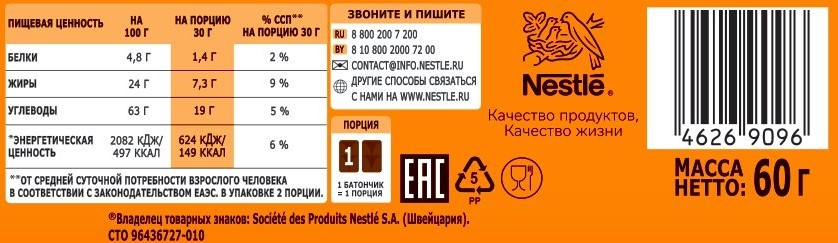 Сахар, патока, жир специального назначения (из пальмового масла), фундук целый, какао тертое, молоко сухое обезжиренное, масло какао, сыворотка молочная сухая, какао-порошок, молоко сухое цельное, молочный жир, эквивалент масла какао (масло пальмовое, масло ши, свекольный концентрат, эмульгаторы (лецитины, E476), белок яичный сухой, ароматизаторы натуральные, регуляторы кислотности (лимонная кислота).