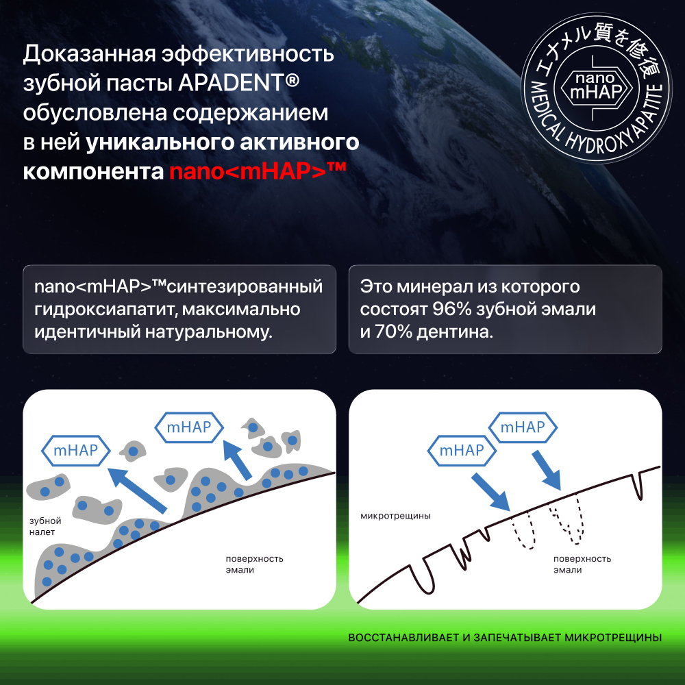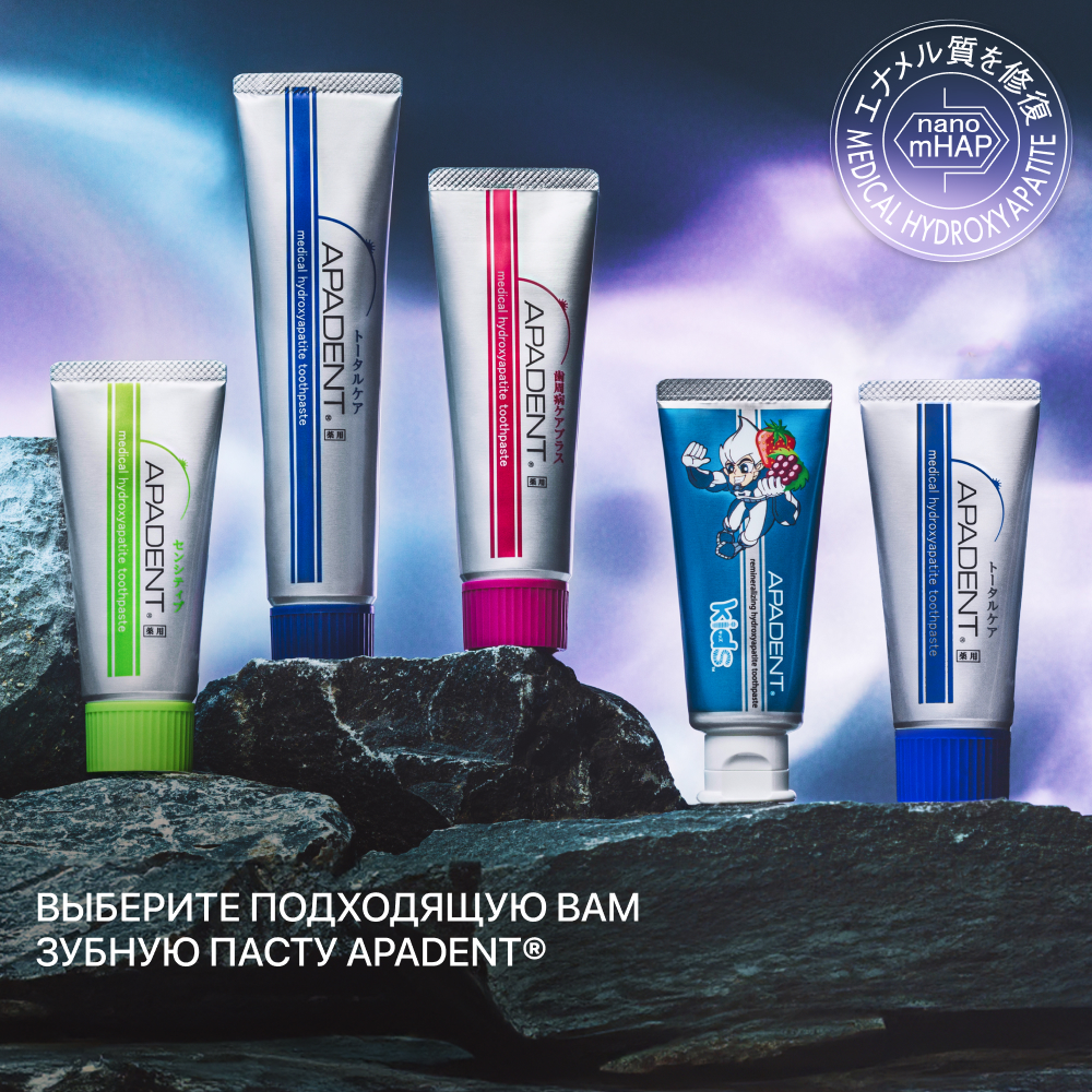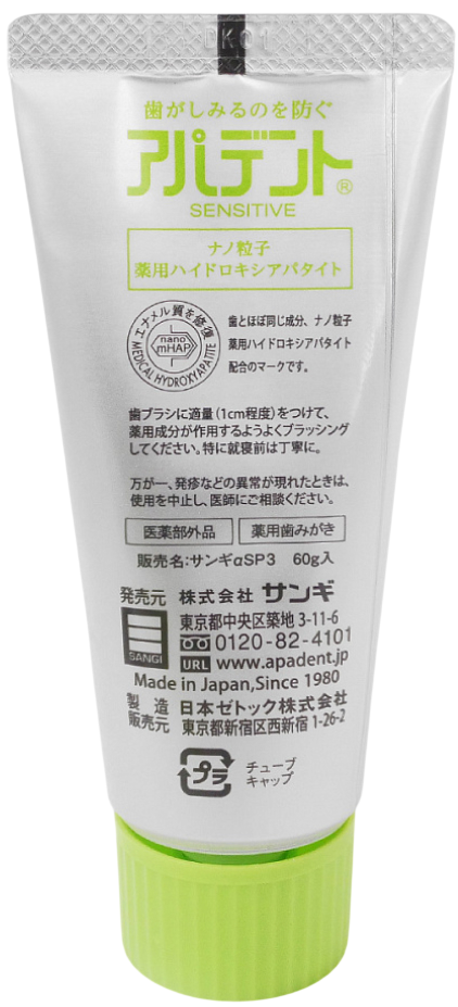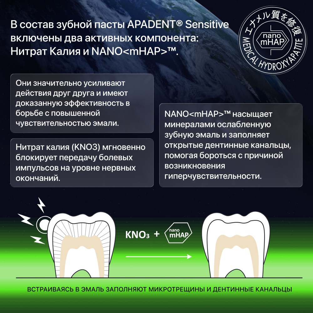 Японская лечебно-профилактическая зубная паста Apadent Sensitive с Медицинским Нано-Гидроксиапатитом и Нитратом Калия разработана для гиперчувствительной эмали. Без фтора. Устраняет не только следствие гиперчувствительности – боль, но и причину ее возникновения – ослабление эмали и оголение дентинных канальцев. Нитрат Калия воздействует на нервные окончания зубов так, что болевой сигнал блокируется и не поступает к нерву. Медицинский Нано-Гидроксиапатит (NANO) - минерал, из которого на 97% состоит зубная эмаль - благодаря нано-размеру частиц и биосовместимости восстанавливает эмаль по всей глубине, заполняет микротрещины на поверхности и закрывает оголенные дентинные канальцы. Таким образом, устраняется причина чувствительности зубов - ослабленная эмаль восстановлена, дентинные канальцы закрыты и раздражители не воздействуют на нервные окончания зуба. Apadent Sensitive универсальна. Рекомендуется, в том числе, беременным женщинам и детям, когда они научились сплевывать пасту.