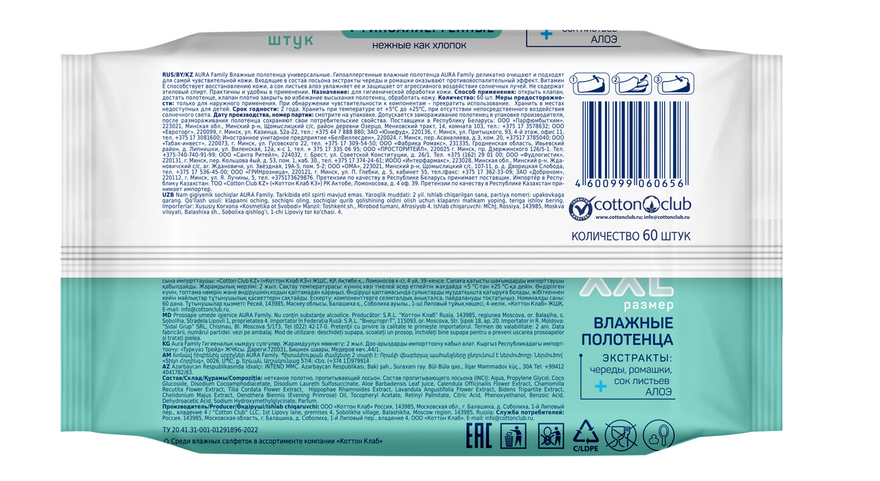 Полотенца влажные Aura Family универсальные гипоаллергенные, 60шт