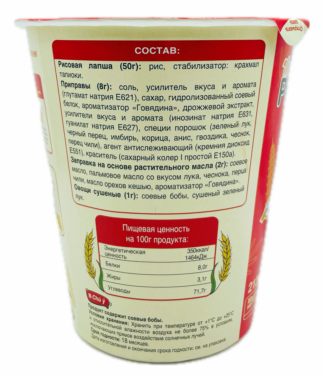 Рисовая лапша 50г: рис, стабилизатор: крахмал тапиоки. Приправы 8г: соль, усилитель вкуса и аромата глутамат натрия Е621, сахар, гидролизованный соевый белок, ароматизатор Говядина, дрожжевой экстракт, усилители вкуса и аромата инозинат натрия Е631, гуанилат натрия Е627, специи порошок зеленый лук, черный перец, имбирь, корица, анис, гвоздика, чеснок, перец чили, агент антислеживающий кремния диоксид Е551, краситель сахарный колер простой Е150а; Заправка на основе растительного масла 2г: соевое масло, пальмовое масло со вкусом лука, чеснока, перца чили, масло орехов кешью, ароматизатор Говядина; Овощи сушеные 1г: соевые бобы, сушеный зеленый лук.